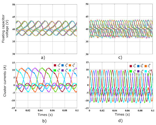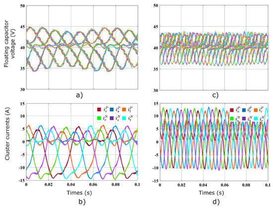Oscilloscope waveforms for this test are presented in Figure 8. HF and LF voltages and currents exhibit good power quality. The voltage regulation of the capacitor is presented in Figure 9, which shows the correct voltage regulation in the 120 power cells of the prototype. The 60 voltages of the cells in MMC1 are presented in Figure 9a, and the 60 voltages of the cells in MMC2 are presented in Figure 9c. As stated above, the ripple in the floating capacitor is indirectly proportional to the difference between the input and output frequencies of the MMC [22]. Therefore, the oscillations in the floating capacitors on the LF side are higher because of the AC–DC port frequency difference. In both cases, the capacitor voltages are properly regulated to an average value of 40 V despite the ripple components. Cluster currents show a DC component since they contain the power transference current (≈2.5 A) plus half of the alternating component of the LF and HF ports with an effective value of 3.75 A approximately (see Figure 9b,d).