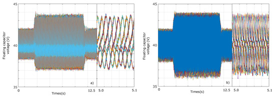 The DC capacitor voltages of the 120 power cells are shown in Figure 13. The 60 DC capacitor voltages of the LF MMC are presented in Figure 13a, including an amplified view of the 60 voltages to visualize the oscillations caused by the 15 Hz grid. Similarly, Figure 13b shows the 60 DC capacitor voltages of the HF MMC. In this case, the oscillations are produced by the 50 Hz grid. In both cases, the voltages are controlled to a mean voltage value of 40 V. When active power is increased, voltage fluctuations are bounded in a ±4 V band in both ports.