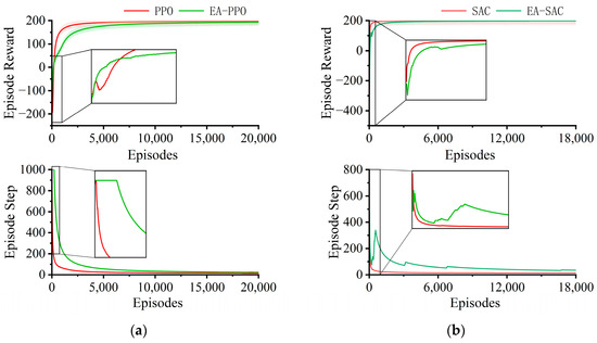 Training comparison between standard algorithms and EA strategy algorithms. (a) Comparison of PPO and EA-PPO training curves; (b) Comparison of SAC and EA-SAC training curves; (c) Comparison of DDPG and EA- DDPG training curves; and (d) Comparison of TD3 and EA- TD3 training curves.