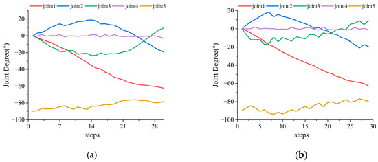 Figure 14 presents the operational conditions of joint angles in the optimal paths planned by the original algorithms and the EM algorithm. In the figure, (a) and (b) correspond to the EM-SAC and SAC algorithms, while (c) and (d) correspond to DDPG and EM-DDPG, respectively. In comparison, it is noticeable that the variation curves in (a) and (d) are significantly smoother and exhibit less jitter, almost negligible. This phenomenon indicates that the paths planned through the EM algorithm have a higher degree of smoothness. This feature of high smoothness means that in practical applications, the robotic arm’s movement will be considerably less jittery, thus achieving more precise positioning. Additionally, smoother motion paths can reduce the robotic arm’s instantaneous acceleration, thereby mitigating wear and tear and prolonging its lifespan. Furthermore, smoother movement paths also reduce the robotic arm’s demand for electricity, consequently lowering energy consumption [4]. Therefore, the excellent performance of the EM algorithm in this regard further confirms its superior performance and broad application prospects in real-world applications.