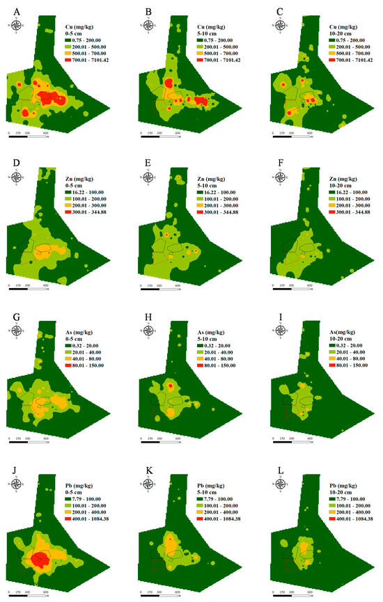 Spatial distributions of heavy metals ((A–C) Cu; (D–F) Zn; (G–I) As; (J–L) Pb; (M–O) Cd; (P–R) Cd) in different soil layers in the studied area.
