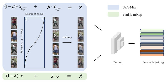 The original mixup [12], a simple data augmentation strategy, is a straightforward linear transformation of the input data to generate a new mixture of samples and corresponding person labels. Briefly, for any two input data–label pairs, and , mixup can be described as