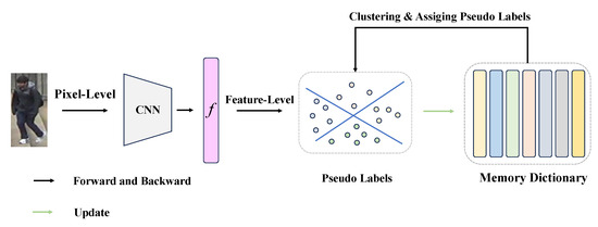 In this paper, the unlabeled dataset is represented as , and N denotes the number of training image sets. Feature extraction is completed by employing ResNet-50 [35], which has already been initialized in ImageNet [36], and it is noted as , where represents the parameters of the network model and denotes the 2048-dimensional feature of the person image. The feature representations are deposited into the memory dictionary [37], and a clustering algorithm is implemented to allocate corresponding pseudo-labels to each person feature representation. Finally, a person Re-ID dataset with pseudo-labels is obtained, and it is denoted as , where x and y are the images in the training dataset and the assigned person pseudo-labels, respectively. During the model training process, the feature representations not only require the parameters in the memory dictionary to be updated, but also require the use of the infoNCE loss function to improve the accuracy of the task.