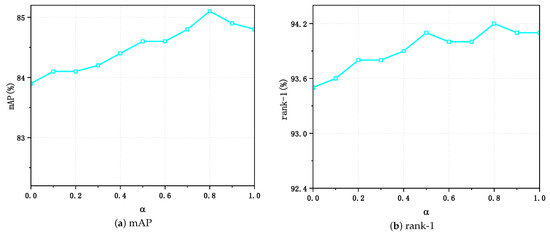 To further exploit the implications of the produced mixed samples for the update of the memory dictionary, a hyper-parameter was set to hold the proportion of generated mixed samples participating in the update of the memory dictionary, and sufficient experiments were conducted in Market-1501, as shown in Figure 3a,b. The UnA-Mix method achieved the optimal performance of 85.2% and 94.2% in terms of the mAP and rank-1, respectively, in Market-1501 when was equal to 0.8.