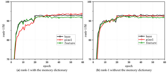 - In comparison to the w.o.MD approach in the pixel-level technique, the w.MD approach had improvements of 0.3% and 0.7% in the mAP and rank-1 metrics for Market-1501, 2.0% and 1.6% for DukeMTMC-ReID, and 3.3% and 2.4% for MSMT17, as Table 2 illustrates. The w.MD technique had improvements of 0.4% and 0% for the mAP and rank-1 for Market-1501, 1.7% and -0.1% for DukeMTMC-ReID, and 1.7% and 2.8% for MSMT17 in comparison to the w.o.MD approach in the feature-level method. It can be observed that improved relative to in the evaluation metrics mAP and rank-1, regardless of whether mixup acted at the feature level or the pixel level. This verified that mixup alleviated the drawbacks of the insufficient number of individual persons in the Re-ID dataset to a certain extent.