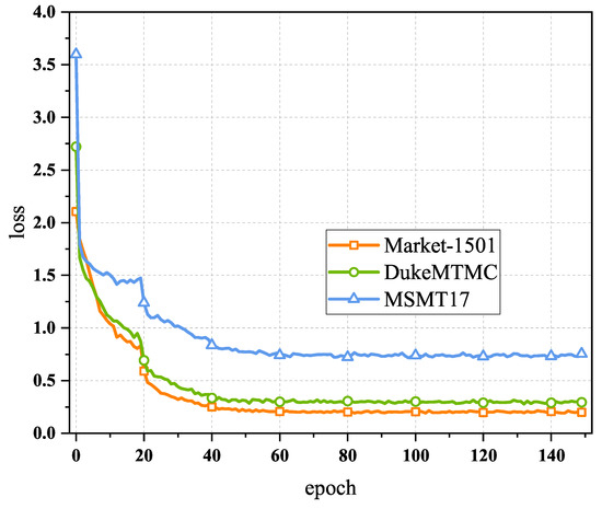 The convergence of an algorithm is a very important property, so we validated it on three benchmark person Re-ID datasets and plotted the changes in the loss value with the epoch. As shown in Figure 7, it was found that the algorithm’s loss value finally converged to a stable value.