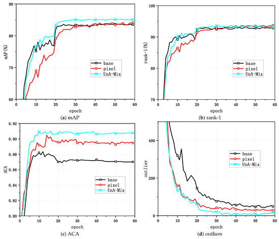 Figure 4 and Figure 5 show the variations in the task evaluation criteria (mAP and rank-1) with the epoch when mixup was applied at different positions in the unsupervised person Re-ID framework for Market-1501. Figure 6 demonstrates the variations in the clustering quality metric (ACA) for Market-1501 with the epoch during the process. The experimental outcomes indicated that the best performance in the task relative to the baseline algorithm was achieved when directly applying mixup at the pixel level and when generating mixed samples that involved updating the memory dictionary.