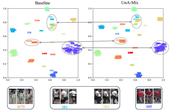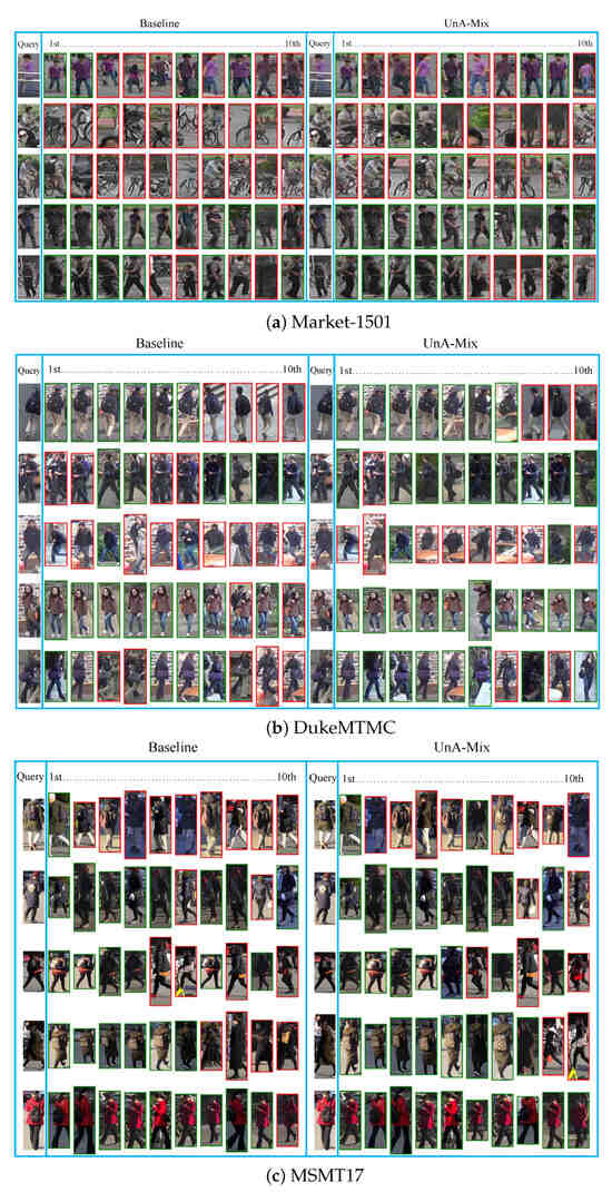 To further elucidate the effectiveness of the method, the variations in the mAP and rank-1 with the epoch were plotted for the baseline, the pixel-level method, and the UnA-Mix method for Market-1501, as shown in Figure 8a,b. Figure 8c depicts the changes in the clustering quality evaluation metric ACA, and Figure 8d represents the clustering outliers with different training methods. In order to more intuitively demonstrate the superiority of UnA-Mix compared to the baseline, quantitative experiments were conducted, and the results are shown in Figure 9 and Figure 10. To enhance the visualization of feature representations extracted with various methods, we employed t-SNE visualization on a randomly selected subset of 20 person identities from the Market-1501 dataset, as illustrated in Figure 9. For clarity, identical person identities are indicated by numbers of the same color. A noteworthy observation is that, in comparison to the baseline method, the UnA-Mix method not only preserved the compactness of clustering groups, but also effectively separated similar individuals in the feature space. This contributed to the network model acquiring a more discriminative representation of person features. To provide a more intuitive depiction of the performance disparity between the different methods, we present visualizations of the top ten best-matching results from the baseline and UnA-Mix methods across the benchmark person Re-ID datasets. In these visualizations, red boxes denote matching errors, while green boxes signify correct matches. The positioning of correct results towards the front of the matching results reflects better method performance. Figure 10 displays these matching results. Clearly, the UnA-Mix method significantly outperformed the baseline method in the benchmark person Re-ID datasets, confirming the efficacy of the UnA-Mix approach.