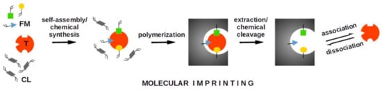 Preparation scheme of molecularly imprinted polymers [43]. Functional monomers (FMs) assemble around a template molecule (T) to form a pre-polymerization complex, which undergoes polymerization in the presence of a cross-linker (CL). Upon template extraction, specific binding sites become available for the template molecule rebinding.