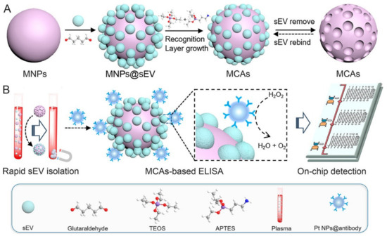 There are several methods for the synthesis of imprinted particles in the literature [89,90,91]. However, most of these methods have some disadvantages, such as amorphous particles, broad size distribution, surfactant remnants, and deep binding sites. So, new sensor systems are developed every day to eliminate these disadvantages [92,93,94]. For instance, Karaseva et al. synthesized imprinted particles for trypsin detection using mini-emulsion polymerization. They optimized the effect of the cross-linker and incubation time on the properties of the microparticles and obtained 200 nm as the size of the particles with a high binding affinity and selectivity. They used these particles as a recognition element for the piezoelectric sensor to sense trypsin and also obtained a linear response in the 0.125–2 μg/mL concentration range with a detection limit value of 0.07 μg/mL. They also observed the behavior of the piezoelectric sensor in pharmaceutical samples [95]. Yang et al. improved magnetic colloid antibodies (MCAs) using MIPs for the analysis of small extracellular vesicles (sEVs). As depicted in Figure 2, they developed a synthetic strategy to prepare MCAs using a surface imprinting approach, which was based on the formation of a supramolecular complex of organosilane monomers together with template sEVs after polymerization. Magnetic nanoparticles (MNPs) were chosen as a carrier material and organosilanes serving as building blocks were used to form a recognition layer, affording MCAs the ability of recognizing, binding, and sensing sEVs based on the shape and size. The MCAs showed a high affinity to sEVs both in cell culture media and in dilute plasma, resulting in sEV enrichment on the surface of MCAs contributing to a further sEV phenotype protein analysis. They also presented that these MCAs had a higher detection yield with more than three-times enrichment of sEVs checked with the conventional centrifugation method. Furthermore, these MCAs also highlighted reusability with the stability of the organosilica detection layer [96].