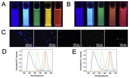 Fluorescent images under a 365 nm UV lamp of pure quantum dots (A) and encoded imprinted particles (B), fluorescent micrographs of encoded imprinted particles (C), fluorescent spectra of pure quantum dots (D) and encoded particles (E) [99].