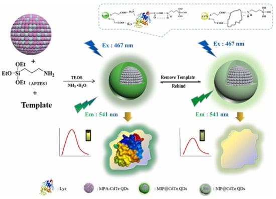 Nanoparticles are one of the most significant classes of nanostructures. They have a great surface-to-volume ratio and improve chemical reactivity, uniform geometry, stability, binding capacity, and smooth dispersion, and also supply high accessibility of binding sites for template molecules [100]. Additionally, other features of nanoparticles including high electrical conductivity and magnetic permeability supply many benefits including usage in imaging, analyses, and molecular diagnostics [101]. For example, Wang et al. proposed a study about a silica-cross-linked-imprinted-nanoparticle-integrated fluorescence sensor for determining the lysozyme. The synthesis procedure and detection principle of 3-mercaptopropionic acid (MPA)-modified CdTe quantum dot (QD)-embedded imprinted nanoparticles are illustrated in Figure 4. The MPA served as a modifier to embellish the appearance of QDs, and the sulfhydryl group of MPA could chelate with nanoparticles of QDs. They used TEOS as the reaction precursor and NH3·H2O as an initiator to prepare silica nanoparticles through the hydrolysis. They observed that the fluorescence intensity of the sensor would increase with the coating CdTe QDs after combining the lysozyme. They obtained a linear range at 10–120 μg/mL of lysozyme concentration with 3.2 μg/mL as the detection limit. They also endeavored to determine the lysozyme in human serum and chicken egg white with high recovery values (95.6–99.2%) [102].