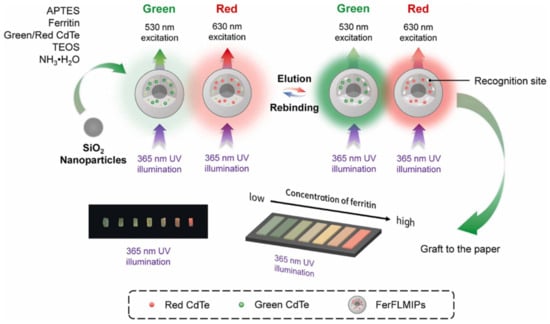 Li et al. prepared a test strip for the detection of ferritin using an imprinted-nanoparticle-modified fluorescence sensor. SiO2 was selected as a core to synthesize the imprinted nanoparticles using the sol–gel method (Figure 5). The green and red imprinted nanoparticles were prepared individually; thus, the electron transfer or energy transfer between green CdTe and red CdTe could be avoided. The imprinted nanoparticles were light-transmissive, which was conducive to the naked eye detection of fluorescence emission. After nanoparticles were loaded on the test paper, the fluorescence color changed gradually from green to red as the ferritin concentration increased. This ensures that the detection can be carried out with the naked eye. In addition, the imprinted-nanoparticle-modified fluorescence sensor displayed a rapid kinetic affinity and experimental data fit a pseudo-second-order kinetic model. They also performed selectivity experiments and observed that the sensor had a much higher specificity for ferritin than other control proteins. They concluded this sensor offers a controllable and fast detection method via combining imprinted nanoparticles and test strips [103].