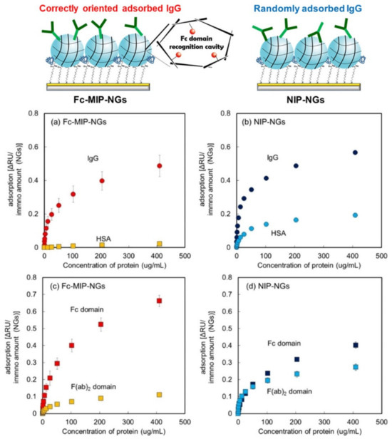 The development of nanogels stimulates different applications, especially for biomedical purposes. Molecularly imprinted-polymer-based nanogels are beneficial for these applications because of their great safety form to functionalize the morphology and responsive features [108,109,110]. As an example, Takeuchi et al. synthesized molecularly imprinted nanogels for protein detection using an optic sensor. They obtained fluorescence resonance energy transfer imaging of rhodamine-labeled albumin and fluorescein-conjugated imprinted nanogels that depicted albumin was conquered by nanogels following the injection. They compared the retention behaviors in liver tissue and concluded imprinted nanogels circulated in the blood for longer than non-imprinted nanogels. They also observed that imprinted nanogels passively accumulated in tumor tissue [111]. Cheubong et al. prepared imprinted nanogels for porcine serum albumin detection using a piezoelectric sensor in beef extract samples. After the characterization and kinetic studies, the sensor demonstrated great selectivity and affinity toward porcine serum albumin checked against reference serum albumins from several animals. They obtained high porcine serum albumin specificity of imprinted nanogels that led to the determination of pork contamination with a detection limit of 1% at 0–2000 μg/mL of porcine serum albumin concentration. They mentioned that the molecularly imprinted nanogels are encouraging candidates for food control [112]. Hayakawa et al. demonstrated the regulation of nanomaterial–cell interaction utilizing an optic sensor that was modified with imprinted nanogels for the determination of immunoglobulin G (IgG). They preferred to use the fragment crystallizable domain of IgG due to the distinctive domain recognition feature concluded in the suppression of the immune-response-receptor-possessing macrophages and natural killer cells. They observed that hindrance of the crystallizable domain triggers an immune response. In addition, the acquisition of stealth ability was prosperously shown in vivo. As seen in Figure 6, they utilized binding isotherms using an optic sensor of IgG, human serum albumin, and domains in imprinted and non-imprinted nanogels [113]. They examined Fc and F(ab′)2 domains to investigate the Fc domain recognition property, the binding properties of Fc-imprinted nanogels and non-imprinted nanogels. In Fc-imprinted nanogels, the amount of the bound Fc domain was significantly higher than that of the F(ab′)2 domain, and Fc-imprinted nanogels showed excellent selectivity toward the Fc fragment. On the other hand, the difference in adsorbed amounts between the Fc and F(ab′)2 domains was smaller in non-imprinted nanogels, indicating that the non-imprinted nanogels had a low selectivity to the Fc domain. Pellizzoni et al. designed fluorescent imprinted nanogels for the detection of an anticancer drug (sunitinib). The effectiveness of these nanogels in directly detecting sunitinib in human plasma was demonstrated through the fluorescence quenching mechanism inherent in nanogels. The detection process involved straightforward dilution of the plasma sample, enabling the recovery of varying amounts of sunitinib. The concentration of sunitinib was quantified using a well-established calibration curve. The limit of detection (LOD) achieved was an impressive 400 nM, showcasing the sensitivity of the developed nanogels. Furthermore, the within-run variability was found to be less than 9%, day-to-day variability was less than 5%, and the accuracy in recovering sunitinib from spiked samples was commendable. These findings collectively underscore the efficacy and reliability of the synthesized fluorescent molecularly imprinted nanogels as a robust platform for sunitinib detection, particularly in complex biological matrices like human plasma [114].