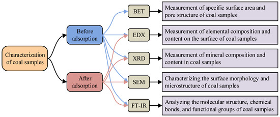 The pathway for the coal sample characterization test is shown in Figure 1. The study of heavy metal ions’ adsorption performance and adsorption mechanism for coal samples requires an understanding of their composition, surface morphology, pore distribution, and molecular structure. Coal samples before and after adsorption were analyzed by X-ray diffraction (XRD) using a Rigaku D/Max-IIB (Bruker, Berlin, Germany) diffractometer to obtain their mineral fractions, and the diffraction angle step was 0.05° during the test. The elemental analyzer Vario EL cube (Elementar GMBH, Frankfurt, Germany) was used to determine the elemental composition and content (EDX) of the coal samples before and after adsorption. An S-4800 (HITACHI, Tokyo, Japan) scanning electron microscope (SEM) was used to capture images of the coal samples before and after adsorption. The test voltage and current were 3 kV and 10 μA, respectively. Measurement of the pore structure of the coal samples before adsorption was performed using a fully automatic specific surface area and microporous physical adsorption instrument (Micromeritics, ASAP-2020 HD-88, Atlanta, GA, USA). The specific surface area (BET), Barrett–Joyner–Halenda (BJH) pore size distribution, and pore size parameters of the coal samples before adsorption were determined using a specific surface area analyzer (ASAP2020HD88). A Shimadzu Model 1.50SU1 was used to measure the coal samples’ Fourier transform infrared transmission spectroscopy (FT-IR) with a 400–4000 cm−1 measurement wavelength range.