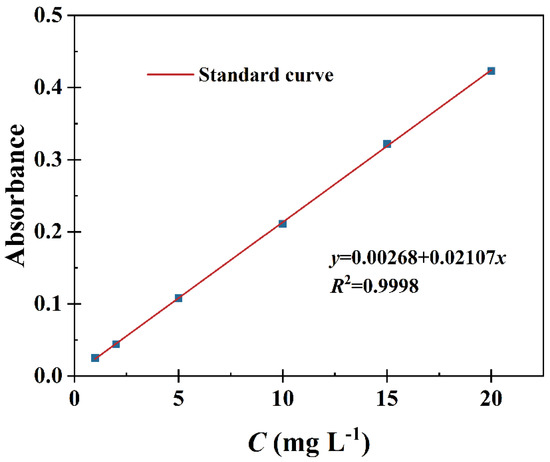 A standard curve for this test method is required to determine the concentration of Fe(II) in a solution after adsorption. Standard Fe(II) solutions with concentrations of 1 mg L−1, 2 mg L−1, 5 mg L−1, 10 mg L−1, 15 mg L−1, and 20 mg L−1 were configured, and the absorbance of the solutions was tested. The standard curve obtained is shown in Figure 2.