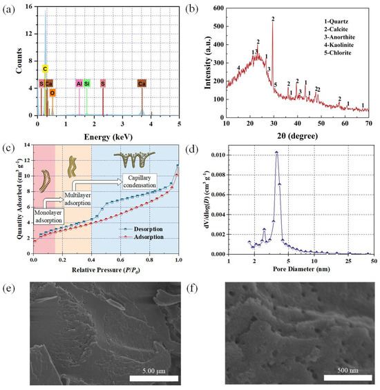 The X-ray diffraction results of the nonstick coal are shown in Figure 3b. Combined with EDX elemental measurements to quantitatively analyze the XRD patterns, it can be concluded that the main mineral components in the coal samples are quartz, calcite, calcium feldspar, and clay minerals. The clay minerals mainly include chlorite and kaolinite. The significant mineral mass fractions in the coal samples are shown in Table 2.