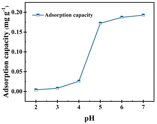According to the literature, it is necessary to research the impact of pH change on the adsorbed Fe(II) in coal samples because some coal mines have acidic mine water [21,22]. The adsorption capacity of Fe(II) on coal samples under different pH values is shown in Figure 4. The experimental results showed that the adsorption of Fe(II) on coal samples increased with the increase in pH value in an “S” shape. The amount of coal sample adsorbed at pH = 2 is only 0.0043 mg g−1. The adsorption of the coal sample rises to 0.0263 mg g−1 at pH = 4. The coal samples’ adsorption rises rapidly to 0.1724 mg g−1 at pH = 5. The coal samples’ adsorption rises to 0.1928 mg g−1 when the pH is 7. The experimental results show that there is a competitive adsorption relationship between H+ and Fe(II) in the solution, leading to a decrease in the adsorption amount of Fe(II), since the adsorption sites in the coal samples tend to undergo a protonation reaction with H+ at lower pH levels, which leads to a decrease in the number of adsorption sites.