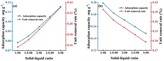 Figure 5 shows the effect of coal samples on the adsorption capacity and unit removal rate of Fe(II) under different solid–liquid ratio conditions. Figure 5a shows the results after 0.5 h of adsorption. It can be seen that with the increase in the solid–liquid ratio, the adsorption capacity of the coal samples for Fe(II) increased linearly from 0.078 mg g−1 to 0.115 mg g−1, and the corresponding unit removal rate increased linearly from 15.6% to 23.1%. Figure 5b shows the results after 2 h of adsorption. It can be seen that with the increase in the solid–liquid ratio, the adsorption capacity of the coal samples for Fe(II) decreased linearly from 0.198 mg g−1 to 0.148 mg g−1, and the corresponding unit removal rate decreased linearly from 39.7% to 29.6%. With the same Fe(II) concentration at the beginning of adsorption (0.5 h), the active sites on the surface of solid particles increased accordingly with the increase in the solid–liquid ratio. Fe(II) in the solution was rapidly adsorbed by the adsorption sites on the surface of the particles before it diffused into the interior of the coal sample particles. Therefore, the adsorption capacity and unit removal rate increased with the increase in the solid–liquid ratio. With the increase in adsorption time (2 h), the concentration of Fe(II) in the solution with a relatively sizeable solid–liquid ratio decreased, which led to the decrease in the adsorption capacity and unit removal rate of the coal samples with the increase in the solid–liquid ratio.
