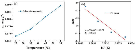 The effect of temperature change on the adsorption of Fe(II) from the coal samples is shown in Figure 6a. As the solution temperature increased from 25 °C to 55 °C, the adsorbed amount of the coal samples gradually increased from 0.168 mg L−1 to 0.189 mg L−1 with an increase of 12.5%, which indicates that the high-temperature environment is favorable for adsorption.