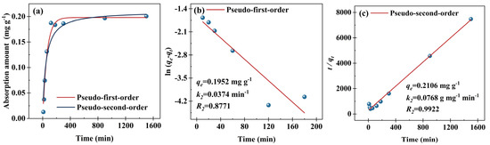 (a) Adsorption kinetics of Fe(II) on coal samples. (b) Pseudo-first-order kinetic model and (c) pseudo-second-order kinetic model from (a).