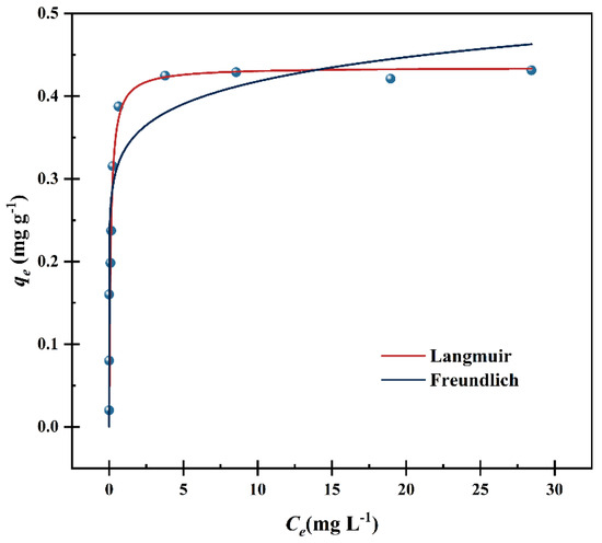 where qe represents the adsorption capacity when the adsorption process reaches a balance at the corresponding concentration (mg g−1); Ce is the concentration of adsorbent in the solution at the adsorption equilibrium (mg L−1); qm is the saturated adsorption capacity of the adsorbent (mg g−1); and b is the Langmuir equilibrium adsorption characteristic constant, which can represent the strength of the adsorption capacity.