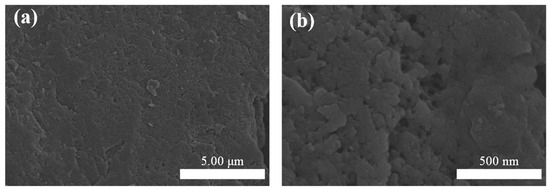 SEM images of coal samples after adsorption of Fe(II). (a) At 5.00 μm scale; (b) At 500 nm scale.
