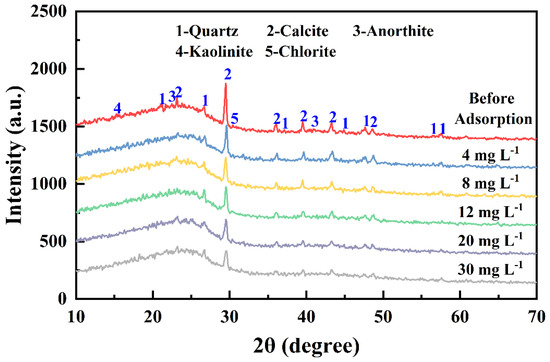 The X-ray diffraction (XRD) patterns of the coal samples after adsorption are shown in Figure 10, where 4 mg L−1, 12 mg L−1, 20 mg L−1, and 30 mg L−1 represent the concentrations of the initial solutions in the isothermal adsorption experimental group. By comparing the XRD patterns of the samples before and after adsorption, the positions of the absorption peaks did not change, which indicated that the mineral composition and crystal structure in the coal were not damaged. The intensity of the absorption peaks at 29.5° and 43.2° showed a small decrease, which indicated that a small number of calcite crystals were decomposed. Since the isothermal adsorption experiment was conducted in a weakly acidic environment (pH = 6), the small number of calcite crystals in the coal samples reacted with H+ in the solution, which led to the decrease in calcite content. The decrease in the elemental Ca content in the EDX results was corroborated by the decrease in calcite content.