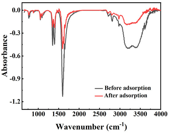 The Fourier transform infrared spectra (FT-IR) of the coal samples before and after the adsorption of Fe(II) are shown in Figure 11. The adsorbed coal samples were taken from the isothermal adsorption experiments after adsorption in a solution with an initial concentration of 30 mg L−1. The intensities of the absorption peaks at 1348 cm−1, 1398 cm−1, 1600 cm−1, and 2600~3600 cm−1 wave numbers of the coal samples were significantly reduced after absorption, which indicated that there was a shedding of the internal functional groups of the coal samples after absorption.