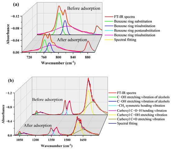 Figure 12a shows the peak fitting of coal samples before and after adsorption in the aromatic ring substitution region (700–900 cm−1). Both can be fitted with four subpeaks, which are the benzene ring monosubstitution near 767 cm−1, two benzene ring trisubstitutions near 770–790 cm−1, and benzene ring pentasubstitution near 883 cm−1. The results of the fitting parameters of each subpeak are shown in Table 6, which shows that the peak position of the benzene ring trisubstituted in the coal samples after adsorption decreased by 10 cm−1. At the same time, the peak positions of the rest of the functional groups remained almost unchanged. The proportion of benzene ring trisubstitution was the highest in the coal samples before adsorption, followed by benzene ring monosubstitution. The highest proportion of benzene ring trisubstitution, followed by benzene ring pentasubstitution, was found in the functional groups of the post-adsorption coal samples. Although the positions and percentages of some functional groups were changed, the overall content of functional groups decreased insignificantly, indicating that the adsorption of Fe(II) was less affected by the functional groups in this region.