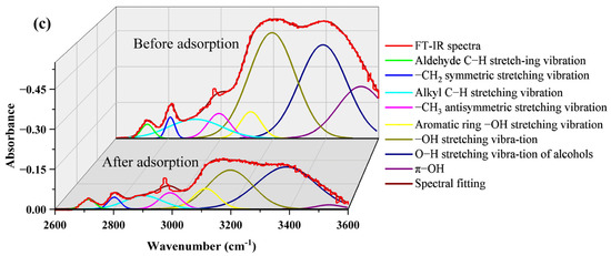 Figure 12c shows the results of peak fitting in the aliphatic region (2600–3000 cm−1) and hydrogen bonding region (3000–3600 cm−1) for the coal samples before and after adsorption. Both can be fitted with six subpeaks. The subpeaks in the aliphatic region are aldehyde C-H stretching vibration near 2718 cm−1, -CH2 symmetric stretching vibration near 2806 cm−1, alkyl C-H stretching vibration near 2902 cm−1, and CH3 antisymmetric stretching vibration near 2992 cm−1. The subpeaks in the hydrogen bonding region are the aryl ring -OH stretching vibration near 3113 cm−1, the -OH stretching vibration near 3194 cm−1, the O-H stretching vibration of the alcohol near 3388 cm−1, and the π -. The results of the fitting parameters for each subpeak are shown in Table 8. Table 8 shows no significant change in the position of the functional groups in the aliphatic region. In contrast, there is a decrease in the alkyl functional group, suggesting a detachment of the CH3/CH2 aliphatic chain during the adsorption process. Similarly, the positions of functional groups in the hydrogen bonding region did not change. In contrast, the peak areas of the -OH functional groups at 3194 and 3388 decreased significantly, indicating the presence of -OH shedding during the adsorption of Fe(II).
