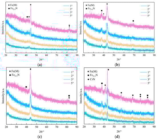 In order to gain a further understanding of the influence of dose rate, XRD was measured at different angles. Figure 3 depicts the phase composition of the implanted layer treated by various implantation dose rates. In our previous research study, the diffraction peak is composed of Fe(M) for the as-received sample [45]. For the samples that underwent ion implantation at a total dose of 2.215 × 1020 ions/cm2, the new Fe2–3N peaks emerged in the X-ray diffraction patterns. This was particularly notable at the high dose rate of 5.18 × 1017 ions/cm2·h ion implantation, as indicated in references [41,47]. Meanwhile, in comparison to the samples implanted at a dose rate of 1.04 × 1018 ions/cm2·h, those treated at dose rates ranging from 2.60 × 1017 to 7.85 × 1017 ions/cm2·h exhibited broadened diffraction peaks. Additionally, their peaks displayed a slight leftward shift by 0.777°. It is observed that the relative intensity of the Fe(M) peaks escalates with an increasing grazing angle. Notably, the slope of the grazing angle at 2° and 3° is more pronounced compared to the other angles. This phenomenon suggests that the high-dose-rate ion implantation leads to a partial substitution of nitrogen ions at the iron sites. Furthermore, during the ion implantation process, this high-dose-rate implantation is likely to cause changes in lattice parameters within the surface layer [41,46].