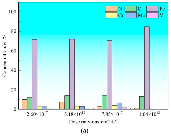 Figure 4 depicts the elemental percentage of the modified layer treated by various implantation dose rates. The weight % and atomic % of the respective elements contained in the implanted surface layer are listed in Table 2. As can be seen in Figure 4a and Table 2, it can be seen that the N concentration decreases from 10.0% to 1.3% and C concentration remains unchanged with the enhanced dose rates, and the Fe concentration initially remains at almost the same value of 70.4~71.9% when the dose rate is between 2.60 × 1017 and 7.85 × 1017 ions/cm2·h, while it increases to 84.7% when the dose rate reaches 1.04 × 1018 ions/cm2·h. From Figure 4b, it can be observed the same phenomena of N concentration decreases from 23.1% to 3.3%, and the Fe concentration initially is approximate and then increases from 41.3% to 55.8%. Meanwhile, the Cr, Mo and V concentration reaches the highest at the dose rate of 7.85 × 1017 ions/cm2·h and reaches the lowest at the dose rate of 1.04 × 1018 ions/cm2·h from Figure 4c,d. This phenomenon primarily arises from the elevated temperatures experienced during high-dose-rate ion implantation. Elevated temperatures suggest that the high-dose-rate implantation promotes considerable nitrogen diffusion [47,48].