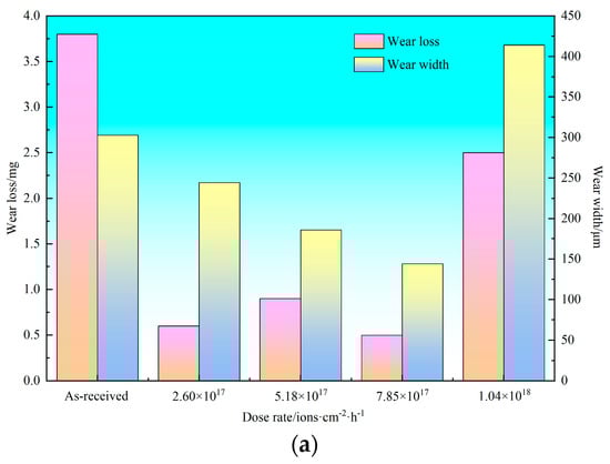 Wear behaviors of samples subjected to different dose rates, (a) wear loss and width, (b) wear rate.