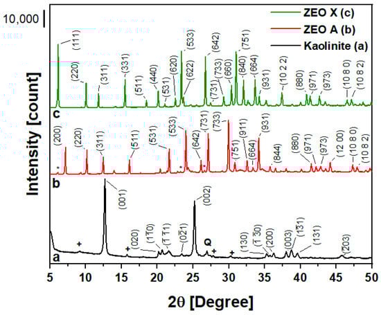 The structural properties of kaolinite, ZEO A and ZEO X were investigated by means of XRPD analysis. The XRPD patterns of the different materials are shown in Figure 1. XRPD patterns are indexed to identify the mineral phases present.
