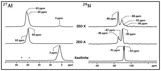 27Al (left panel) and 29Si MAS NMR spectra (right panel) of kaolinite, ZEO A and ZEO X. The signals related to the 27Al nuclei in tetrahedral coordination within the illite and montmorillonite impurities in the parent kaolinite are marked with ‘*’.