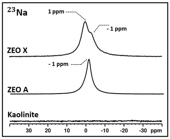 By considering that NaOH was employed as a mineralizing agent for the synthesis of ZEO A and ZEO X, it is probable that both of the zeolites are in the Na+ form, hence with Na+ extra-framework cations that counterbalance the negative charges that arise from the presence of the AlIII atoms []. In this respect, 23Na MAS NMR spectroscopy provides an efficient tool to investigate this aspect. The 23Na MAS NMR spectra of kaolinite, ZEO A and ZEO X are shown in Figure 3.