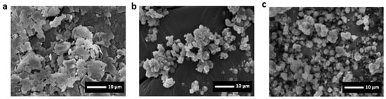 SEM micrographs at a magnification of 2000× of kaolinite (a), ZEO A (b) and ZEO X (c).