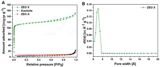 The textural properties of the parent kaolinite, ZEO A and ZEO X were investigated by means of N2 physisorption analysis at 77 K. The N2 adsorption–desorption isotherms of the samples and the DFT pore size distribution of ZEO X (silica/zeolite, ads. branch method, cylindrical pores) are shown in Figure 5. In Table 2 the SSABET and the pore volumes of the different materials are reported.