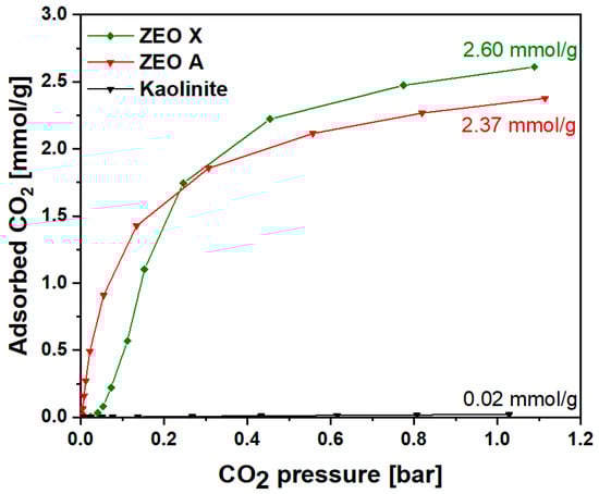 To evaluate a possible application in the field of carbon capture and storage, CO2 adsorption at 25 °C and up to 1 bar was assessed for all the synthesized materials. The excess adsorption of the parent kaolinite, ZEO A and ZEO X was investigated by means of a prototype volumetric apparatus. Kaolinite shows a very limited CO2 adsorption capacity, while the CO2 adsorption capacity of ZEO A and ZEO X were found to be 2.60 and 2.37 mmol/g, respectively, at ca. 1 bar of gas pressure and 25 °C. Moreover, it was demonstrated that the ZEO X sample can be thermally regenerated without any significant loss of its CO2 adsorption capacity.