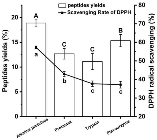 Effects of different proteins on peptides yield and scavenging rate of DPPH of pecan cake in the batch enzymatic hydrolysis process. Different capital letters (A, B, C) indicate significant differences in peptide yields (p < 0.05). Different lowercase letters (a, b, c) indicate significant differences in DPPH free radical scavenging rates (p < 0.05).