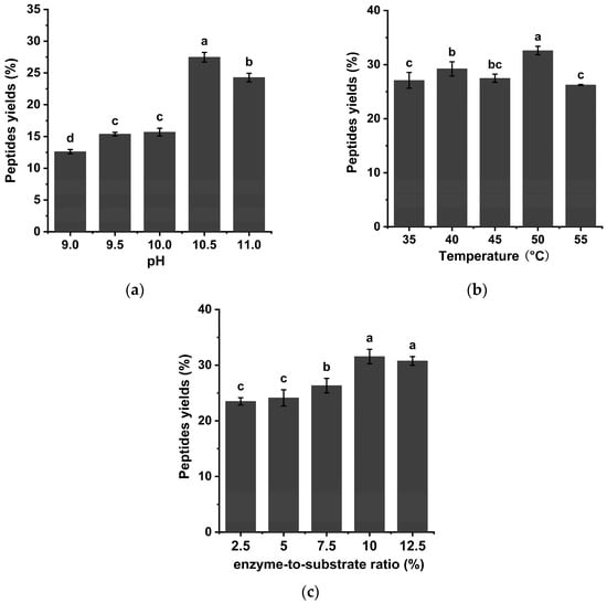 Effects of pH, temperature, and enzyme-to-substrate ratio on peptides yields of Carya cathayensis cake in batch enzymatic hydrolysis. (a) pH, (b) Temperature, (c) enzyme-to-substrate ratio. The bars with different letters indicate the significant differences (p < 0.05).
