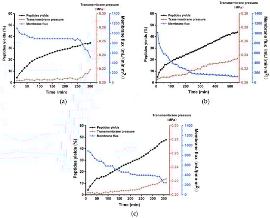 Peptide yields were measured using Wu et al.’s method [12] with a slight modification. The same volume of 10%(w/v) of trichloroacetic acid was mixed with the permeate solution and stood for 10 min to precipitate the insoluble peptides and proteins in the solution. The mixture was centrifuged at 7000 r/min, 4 °C for 10 min, and diluted with 5% trichloroacetic acid to a suitable multiple. The soluble peptide content in the supernatant was measured by spectrophotometer (Model T6, General Instrument for General Analysis, Beijing, China) at 540 nm using the biuret method. The peptide yield can be calculated by Formula (1):