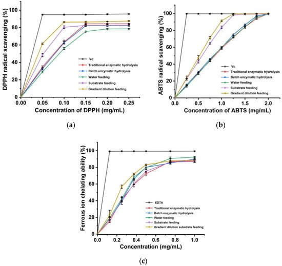 As illustrated in Figure 4, the Chinese pecan cake peptides produced through the gradient dilution feeding enzyme membrane coupling process manifested optimal DPPH free radical scavenging, ABTS free radical scavenging, and ferrous ion chelating capacities, achieving half-maximal inhibition rates at concentrations of 0.044, 0.518, and 0.250 mg/mL, respectively, which were lower than the reported IC50 values of some peptides. For example, the DPPH radical scavenging rate was 0.3 mg/mL for peptides extracted from hickory cake meal protein with complex proteases, and the ABTS radical scavenging rate was 1.8 mg/mL for peptides extracted from watermelon seed protein with alkaline proteases [12,26]. The Chinese pecan cake meal peptides produced by the gradient dilution feeding mode had a ferric iron chelating rate of 71.94% at a concentration of 0.375 mg/mL, which was comparable to that of mulberry leaf protein hydrolysate (73.2%, 0.4 mg/mL), and higher than alfalfa leaf peptides (65%, 0.5 mg/mL) [27,28]. This superiority can be ascribed to the copious presence of hydrophobic amino acids in Chinese pecan cake protein. The gradient dilution feeding mode meticulously regulated the protein concentration within a suitable range within the reactor, ensuring the complete binding of proteinases to substrates. Consequently, this induced the abundant release of specific functional groups, which actively engaged with free radicals and metal ions, leading to remarkable antioxidant effects [17].