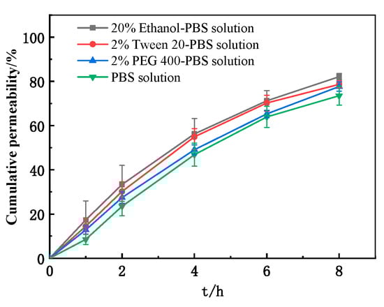 At 37 °C, 300 rpm, with 3% NA aqueous solution, and when the supply amount was 2 g, we used pig ear to subcutaneously explore the effect of different receiving liquids on the penetration of nicotinamide. The receiving liquids were 20% ethanol-PBS solution, 2% Tween 20-PBS solution, 2% PEG 400-PBS solution, PBS solution, and NA. We obtained in vitro percutaneous penetration results within 8 h as shown in Figure 1. The results showed that there was no significant difference in the effect of changing the composition of the receiving liquid on its penetration within 8 h (p > 0.05). At 8 h, the cumulative permeability was 82.14%, 78.64%, 77.69%, and 73.52%, respectively. Considering the actual situation of the human body and that the transdermal raw materials are water-soluble substances, PBS solution was used as the receiving solution in the subsequent experiments.