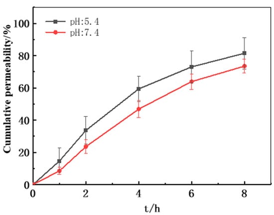 At 37 °C, 300 rpm, with 3% NA aqueous solution, and when the supply amount was 2 g, the pig ear was subcutaneously used to investigate the effect of the pH of different PBS solutions on the penetration of nicotinamide. The results are shown in Figure 2. When the pH value of the receiving PBS solution was 7.4 and 5.4, respectively, the results showed that within 8 h, changing the pH of the receiving solution had no significant effect on its penetration (p > 0.05). At 8 h, the cumulative permeability was 73.52% and 81.48%, respectively. For nicotinamide, weak acidity was beneficial to in vitro percutaneous penetration.