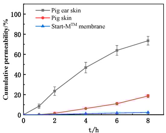 At 37 °C, 300 rpm, with 3% NA aqueous solution, a 2 g supply, and PBS solution (pH: 7.4) as the receiving solution, the effects of different skin models on the penetration of nicotinamide were investigated. The skin models were pig ear skin, pig skin, and Start-MTM membrane. The results are shown in Figure 3. The results showed that within 8 h, there was a significant difference in the effect of changing the skin membrane model on its penetration (p < 0.05); at 8 h, the cumulative permeability was 73.52%, 18.66%, and 2.28%, respectively, and the cumulative permeability of pig ear skin was four times that of pig skin at 8 h. It was almost impermeable under Start-MTM.