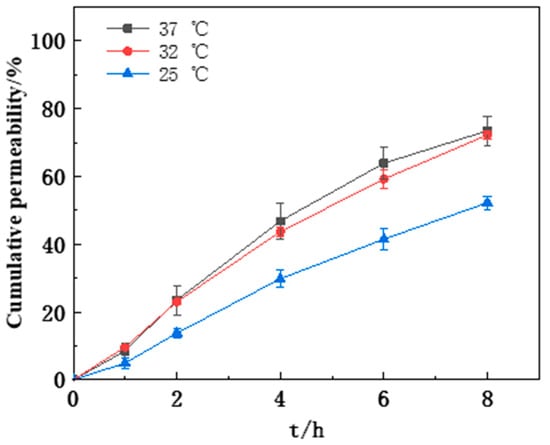 The effects of different water bath temperatures on the penetration of nicotinamide were investigated at 300 rpm, with 3% NA aqueous solution, a 2 g supply, and using pig ear skin and PBS solution (pH: 7.4). The water bath temperatures were room temperature, 25 °C; human body surface temperature, 32 °C; and human body temperature, 37 °C. The results are shown in Figure 4. The results showed that within 8 h, there was a significant difference in the effect of changing the water bath temperature on its penetration (p < 0.05); the cumulative permeability at 8 h was 73.52%, 72.25%, and 52.25%, respectively.