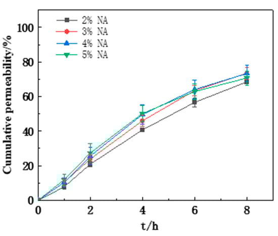According to a number of test results, the expert panel of the American Cosmetics Raw Materials Review Committee found that the use of 3% NA in cosmetics had no significant irritation, sensitization, and photosensitivity to the skin. When cosmetics containing nicotinamide are used for a long time, the daily dosage is not more than 3 g. The content of nicotinamide in cosmetics is generally 2–5%. A total of 4% of nicotinamide may cause intolerance in 20% of people. Cosmetics containing 5% nicotinamide can block ultraviolet rays in large quantities and reduce skin immunosuppression by smearing. In this experiment, the effect of 2–5 wt% NA on its permeability was explored, and it was found that the concentration had no effect on the cumulative permeability, but had a significant effect on the cumulative permeability (p < 0.05), and the cumulative permeability increased with the increase in concentration.