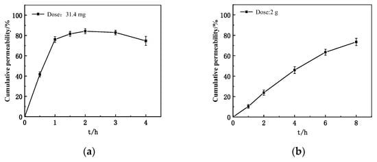 Cumulative permeability of nicotinamide under different doses conditions (n = 3). (a) Doses: 31.4 mg; (b) Doses: 2 g.